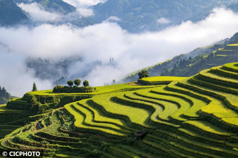 ↑2025年8月27日在贵州省黔东南苗族侗族自治州从江县加鸠镇拍摄的梯田。(无人机照片)CICPHOTO/吴德军 摄