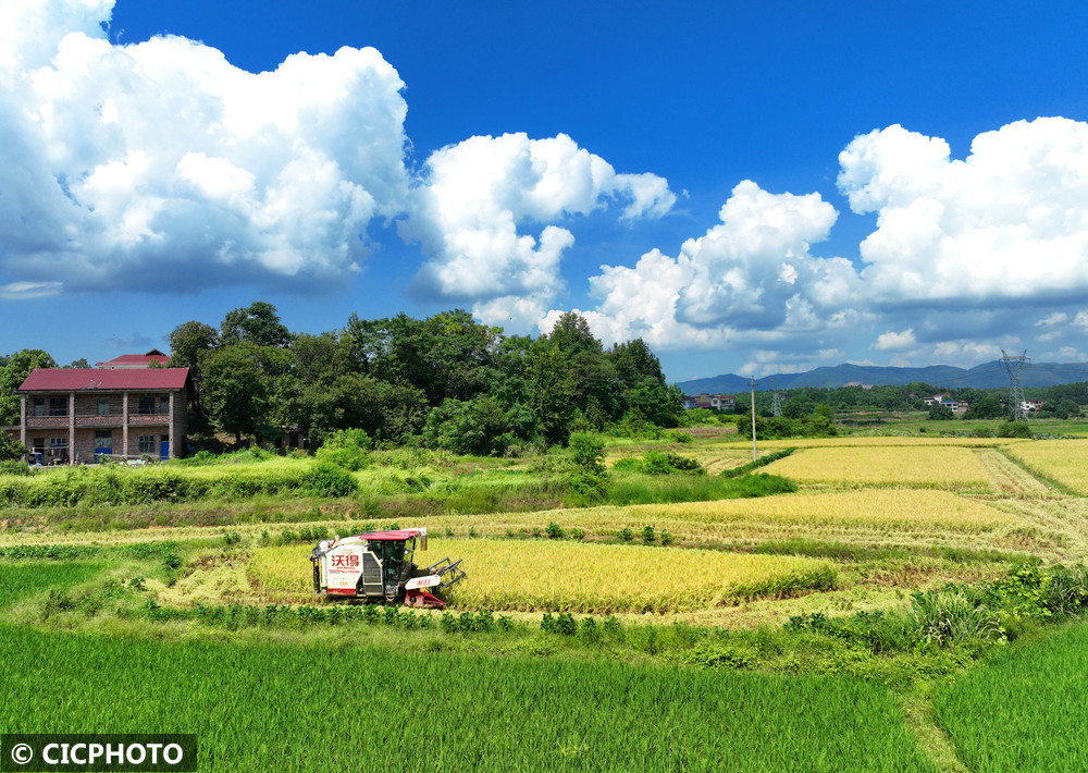 ↑2025年8月17日,湖南省衡阳市祁东县灵官镇的农民驾驶农机收割水稻。(无人机照片)CICPHOTO/曹正平 摄
