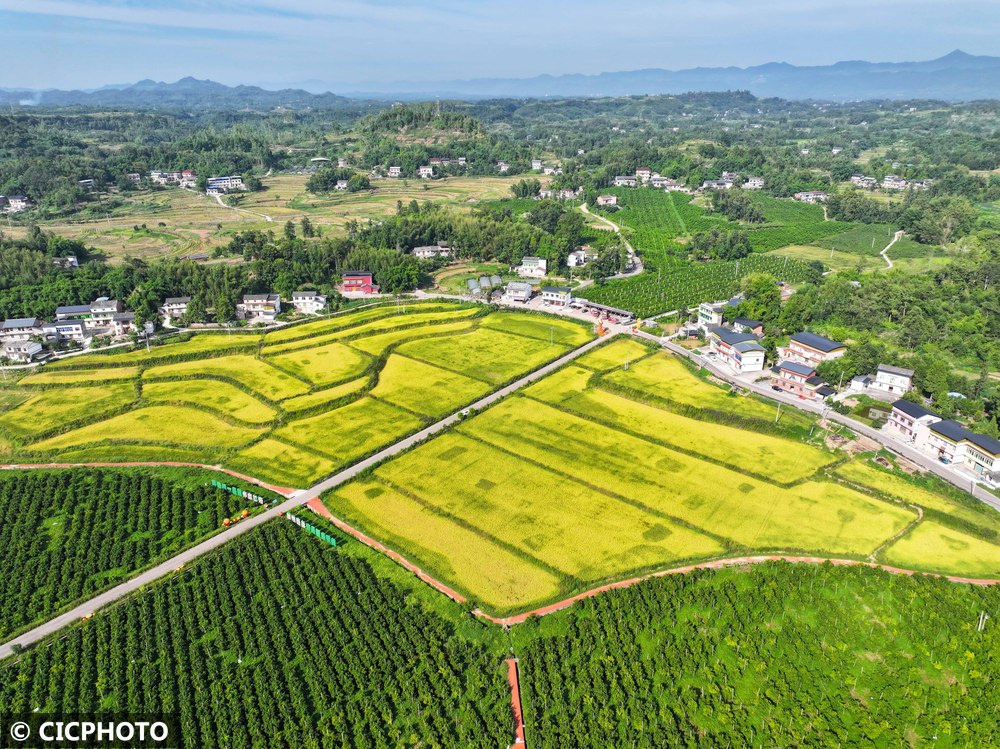 ↑2025年8月24日在重庆市梁平区安胜镇龙印村拍摄的稻田。(无人机照片)CICPHOTO/刘辉 摄