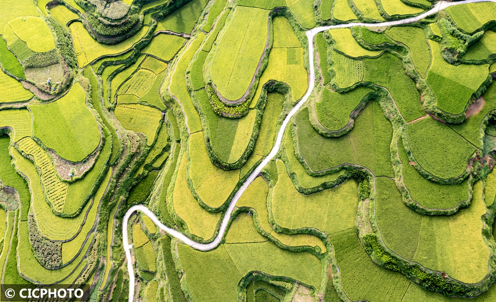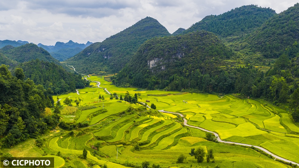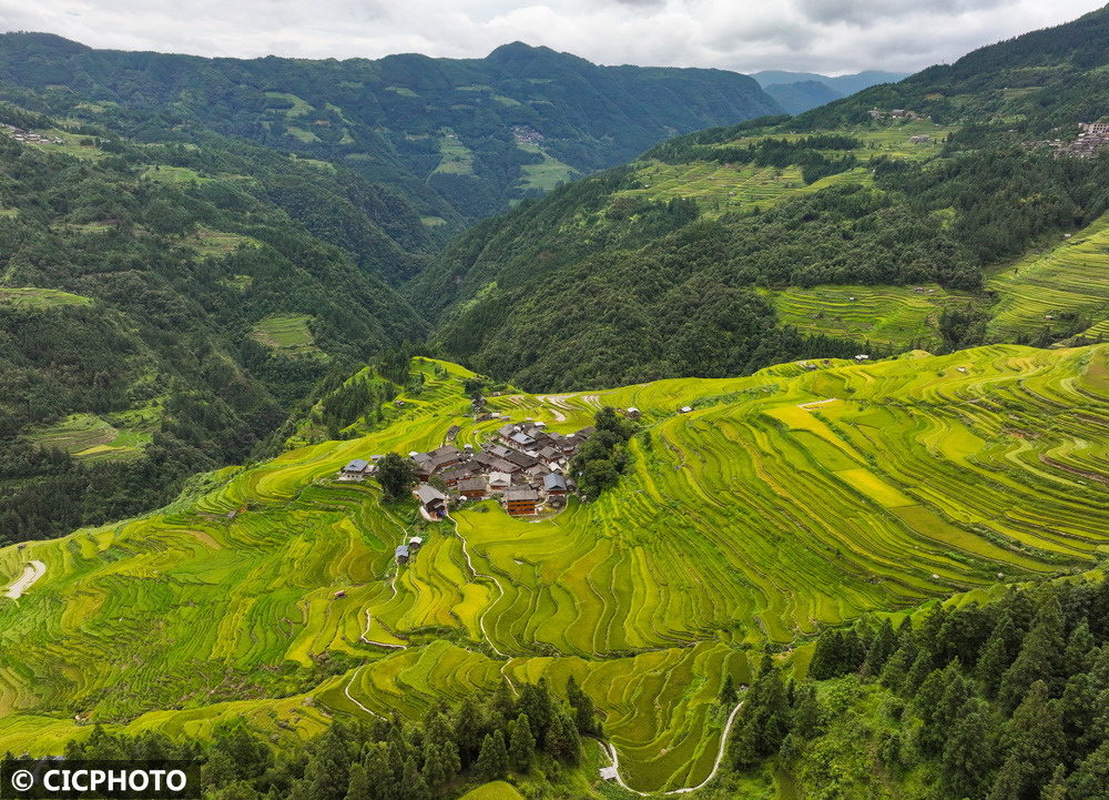 ↑2025年9月7日在贵州省黔东南苗族侗族自治州从江县洛香镇上皮林村拍摄的稻田。(无人机照片)CICPHOTO/罗京来 摄