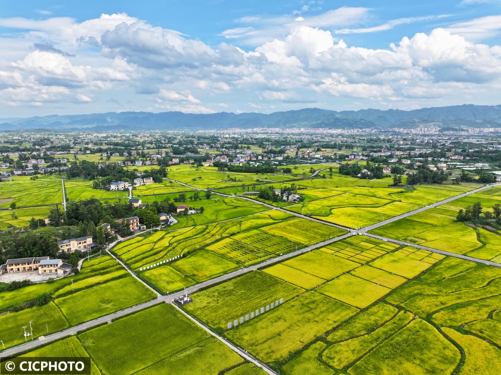 ↑2025年8月25日在重庆市梁平区仁贤街道五一社区拍摄的稻田。(无人机照片)CICPHOTO/刘辉 摄