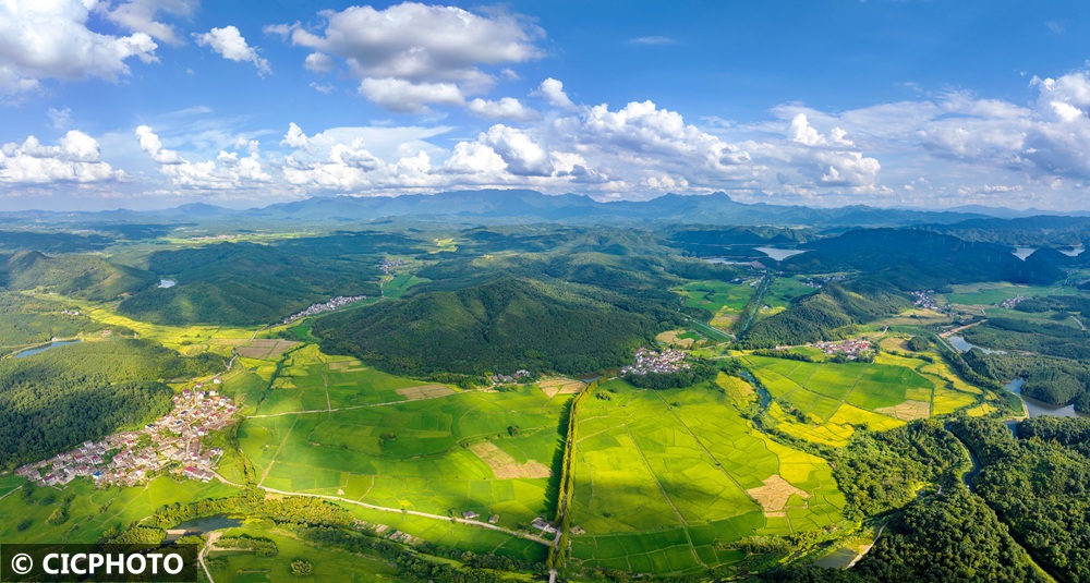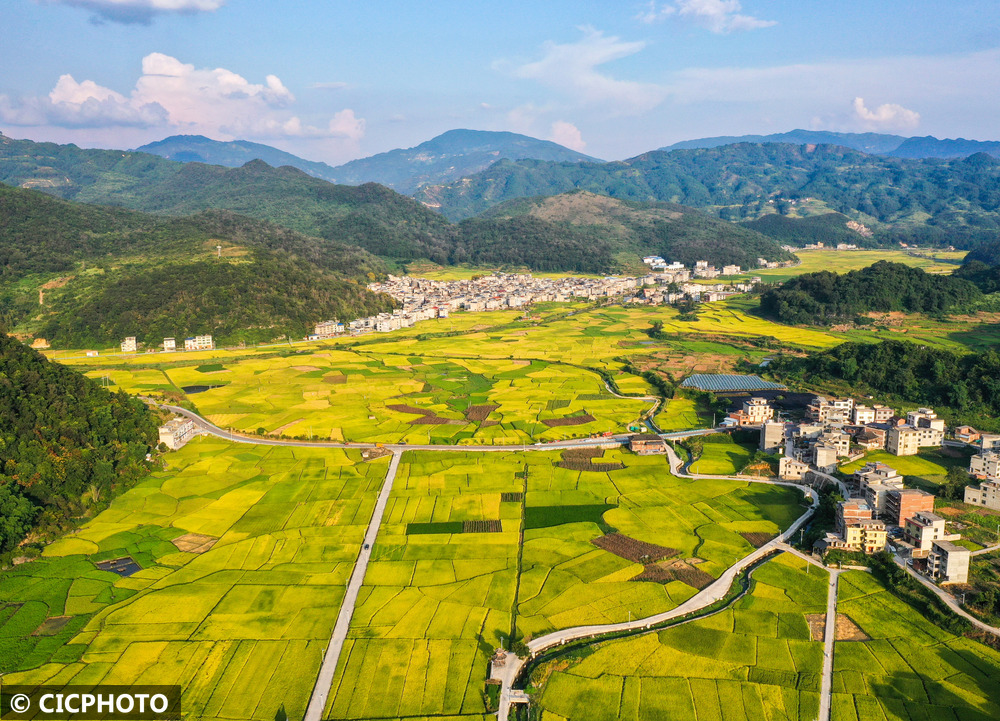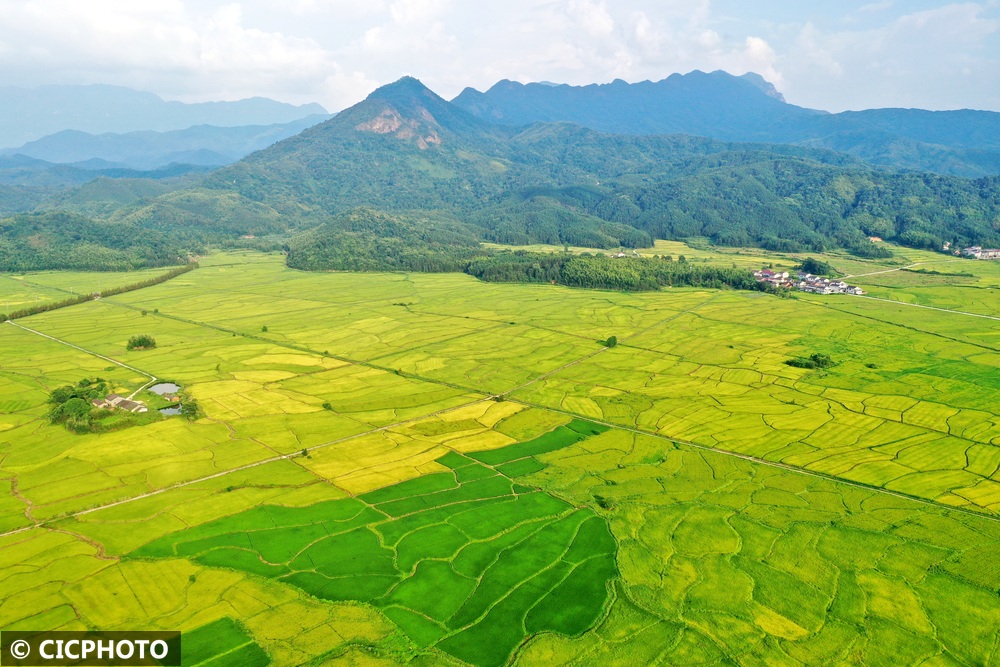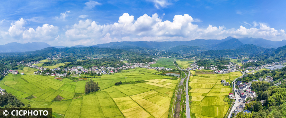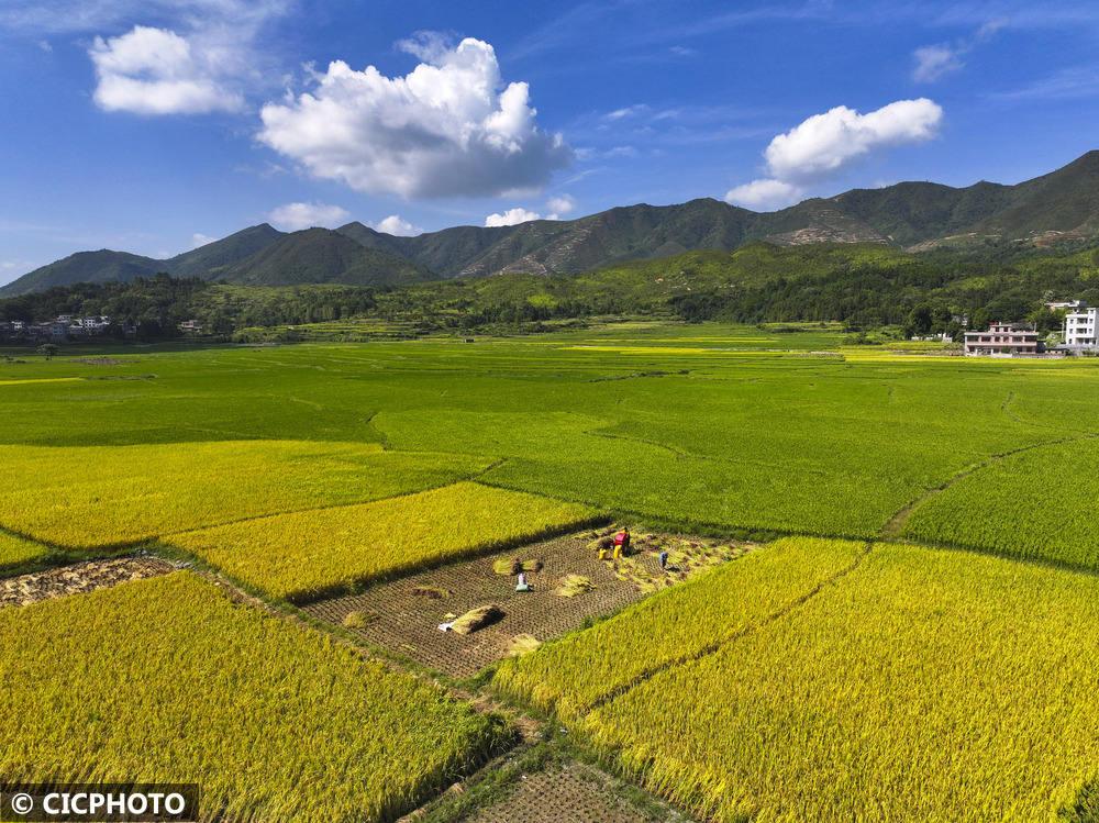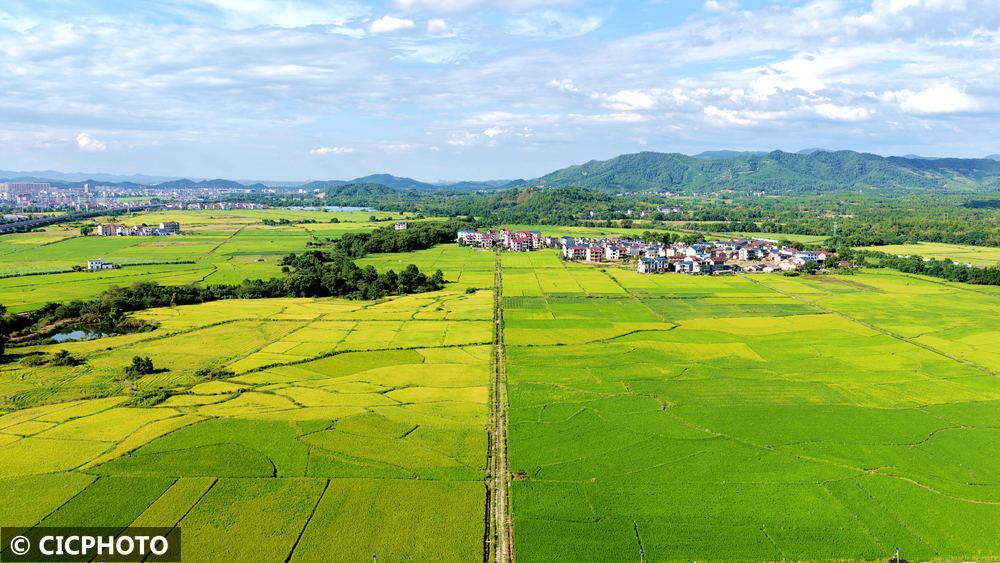 初秋时节,各地水稻陆续成熟,黄绿相间的稻田在蓝天白云映衬下呈现喜人的丰收美景。