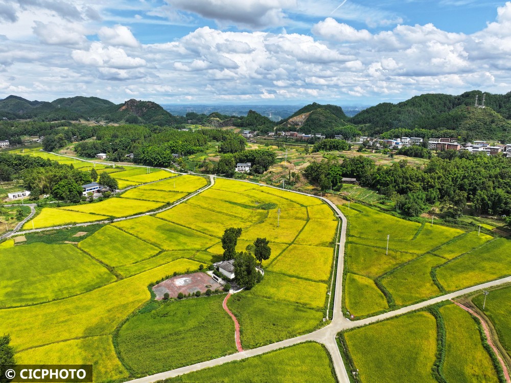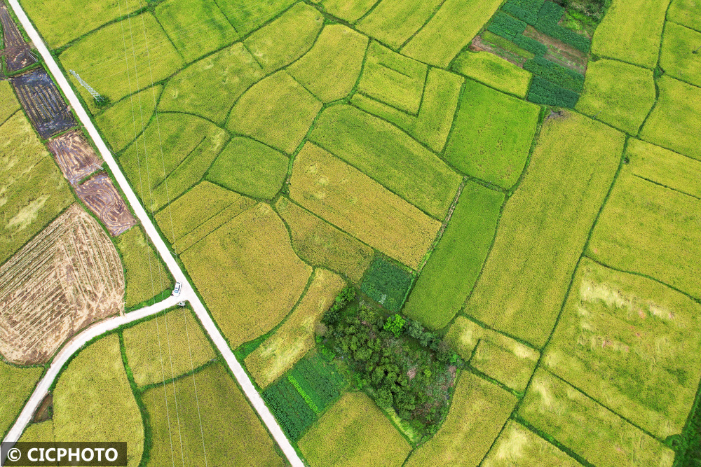 ↑2025年9月11日在重庆市梁平区铁门乡长塘村拍摄的稻田。(无人机照片)CICPHOTO/刘辉 摄