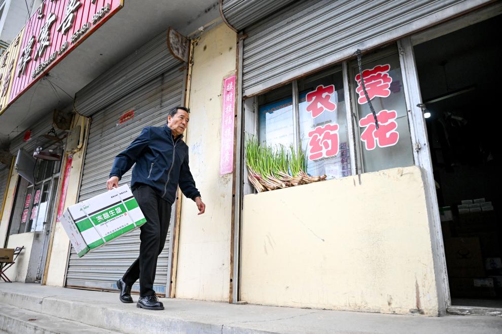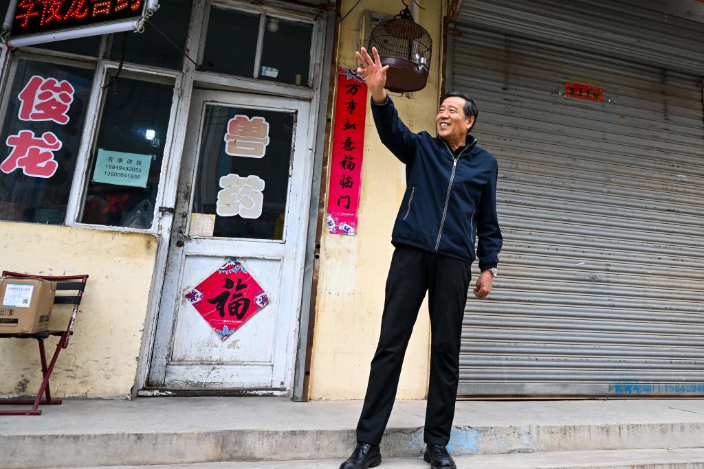 9月22日,孙保卫在自己经营的兽药店门口向朋友挥手致意。新华社记者 李志鹏 摄
