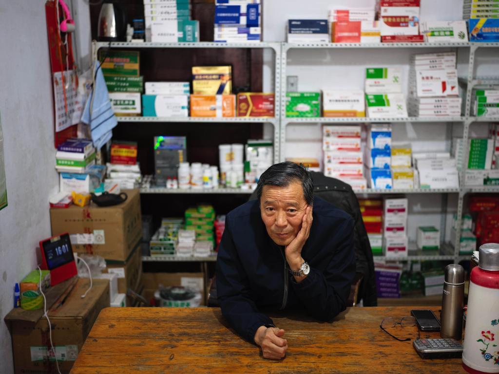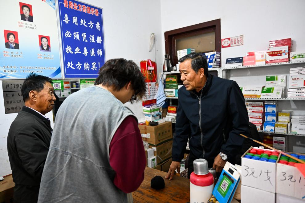 9月22日,孙保卫在自己经营的兽药店中等待顾客。新华社记者 刘金海 摄