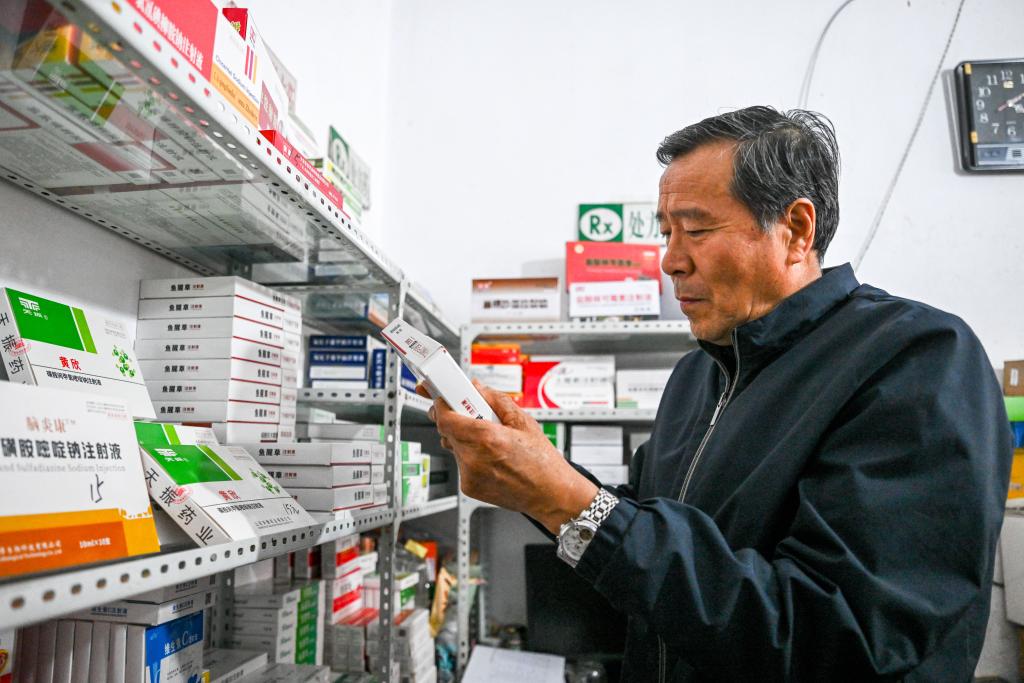 9月22日,孙保卫在自己经营的兽药店里查看药品。新华社记者 连振 摄
