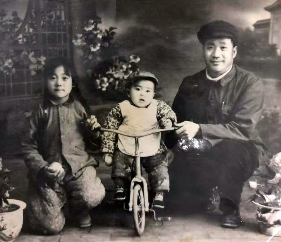 孙保卫(中)一岁时与养父(右)、姐姐合影(受访者提供)。