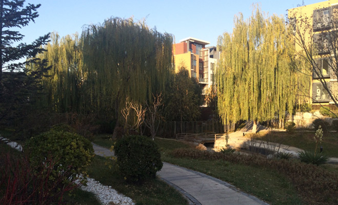 在首開常青藤內(nèi)部,記者看到不少業(yè)主在小區(qū)里散步。小區(qū)內(nèi)景觀園林依地勢而建,庭院、水景、花草高低錯落有致,植被茂盛。談到小區(qū)的環(huán)境,業(yè)主表示很滿意。小區(qū)內(nèi)部還建有水景,不過由于時值冬天,記者并沒有看見水流。