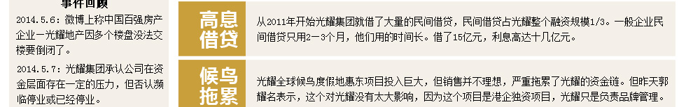 興潤崩盤,曾被媒體評論為“推倒了2014年中小房企崩盤的第一張多米諾骨牌”。隨后,資金鏈斷裂、房企破產(chǎn)、項(xiàng)目爛尾等聲音此起彼伏,這些案例中,最令市場關(guān)注的,莫過于近日瘋傳的“光耀地產(chǎn)資金鏈斷裂”事件。5月7日光耀地產(chǎn)公開發(fā)表聲明,承認(rèn)公司面臨資金鏈問題,但否認(rèn)了瀕臨破產(chǎn)的說法,之后也表示愿意接受其他企業(yè)的收購。 |