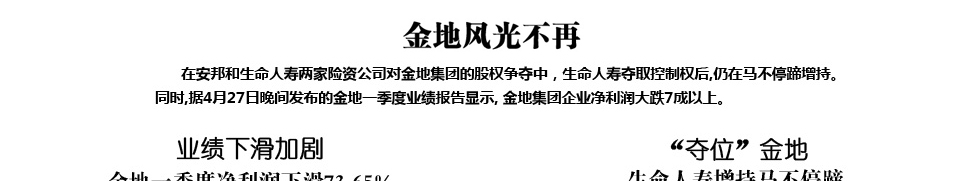 險(xiǎn)資“咄咄逼人” 股權(quán)之爭何時(shí)了? 根據(jù)金融街一季報(bào)顯示,除了第一大股東北京金融街集團(tuán)為國有法人外,十大股東中的其他均是機(jī)構(gòu)投資者:4家保險(xiǎn)、3家信托和2家基金重倉。 4月底和諧健康險(xiǎn)舉牌后,安邦系已經(jīng)成為第二大股東。加上舉牌后的和諧健康險(xiǎn),其余九大股東總共持倉為13.45%。其中,安邦保險(xiǎn)子公司和諧健康險(xiǎn)一季度持股金融街5162.6萬股,占比1.71%,位列第三大股東。 5月6日,金融街控股股東金融街集團(tuán)及其一致行動人增持了公司股份55,000,000股,占公司股份總數(shù)的1.82%。增持后,大股東合計(jì)持有金融街股份總數(shù)的29.74%,逼近30%的收購邀約線。 |