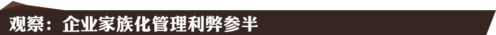 然而,在外界看來,“家族化”管理和“去家族化”管理各有利弊。國泰君安分析師余立峰在接受新華網(wǎng)的采訪時表示,“家族化”管理在企業(yè)發(fā)展初期還是有一定的優(yōu)勢,因為規(guī)模比較小,區(qū)域化較強,管理權制也相對集中,這樣有利于公司整體的規(guī)模和銷售的擴大。隨著企業(yè)的發(fā)展到了一定程度以后,也就是到了全國化布局的時候,需要區(qū)域上的分制,使總部和區(qū)域管理出現(xiàn)分制。