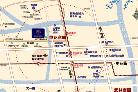 小區(qū)以紫荊花路為縱向主軸,可連接金渡北路、文一西路、天目山路和規(guī)劃中的地鐵5號(hào)線;東西向可以走留祥路,可以到達(dá)繞城高速、上塘高架、莫干山路;距離紫金港路延伸段也不遠(yuǎn),通往紫之隧道,方便到達(dá)之江、濱江等區(qū)域。