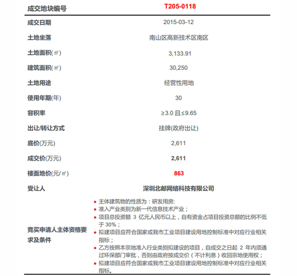 本周(3.9-3.15)成功出讓1宗經(jīng)營(yíng)性用地,由深圳北郵網(wǎng)絡(luò)科技有限公司以底價(jià)成交。