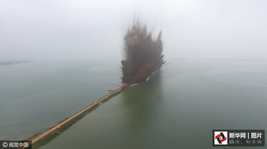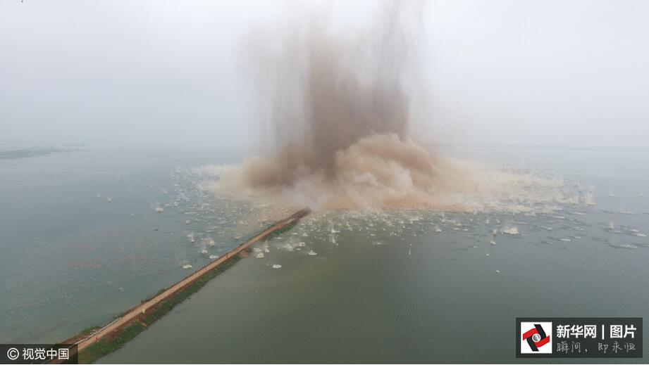 ??? 7月14日7時(shí),伴隨著一聲聲的爆破轟鳴,梁子湖與牛山湖隔堤正式實(shí)施爆破作業(yè),這標(biāo)志著湖北梁子湖流域的牛山湖正式破垸分洪。(圖片來源:視覺中國(guó))