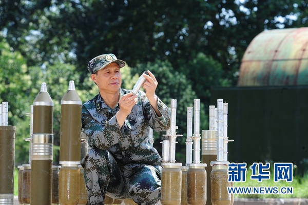 中國工程院院士、軍事科學院國防工程研究院研究員任輝啟檢查彈體作用情況(資料照片)?! ⌒氯A社發(fā)(侯藝兵 攝)