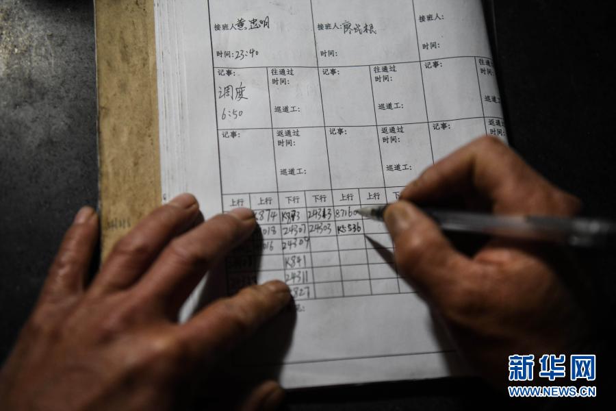 看守工廖成根在避車洞內(nèi)記錄當(dāng)天值班情況(1月30日攝)。