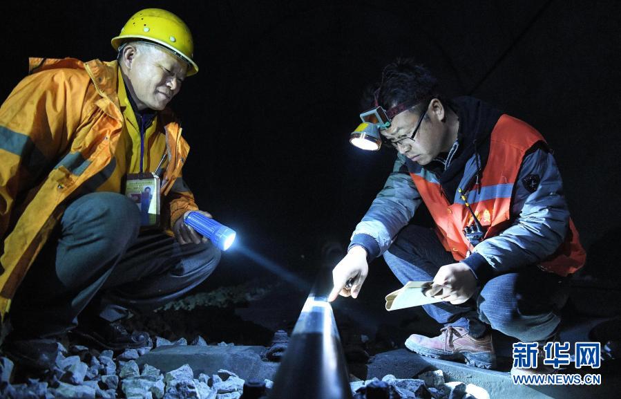 看守工廖成根(左)與工長(zhǎng)羅昌偉檢查隧道內(nèi)鋼軌軌面狀態(tài)(1月30日攝)。