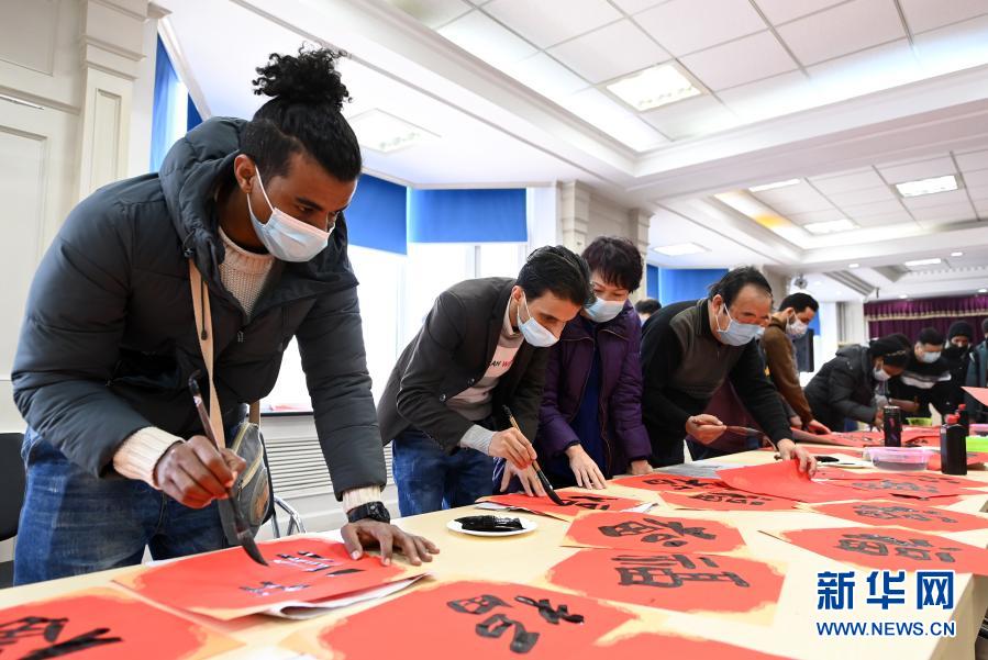 2月4日,外國(guó)留學(xué)生在學(xué)寫福字。