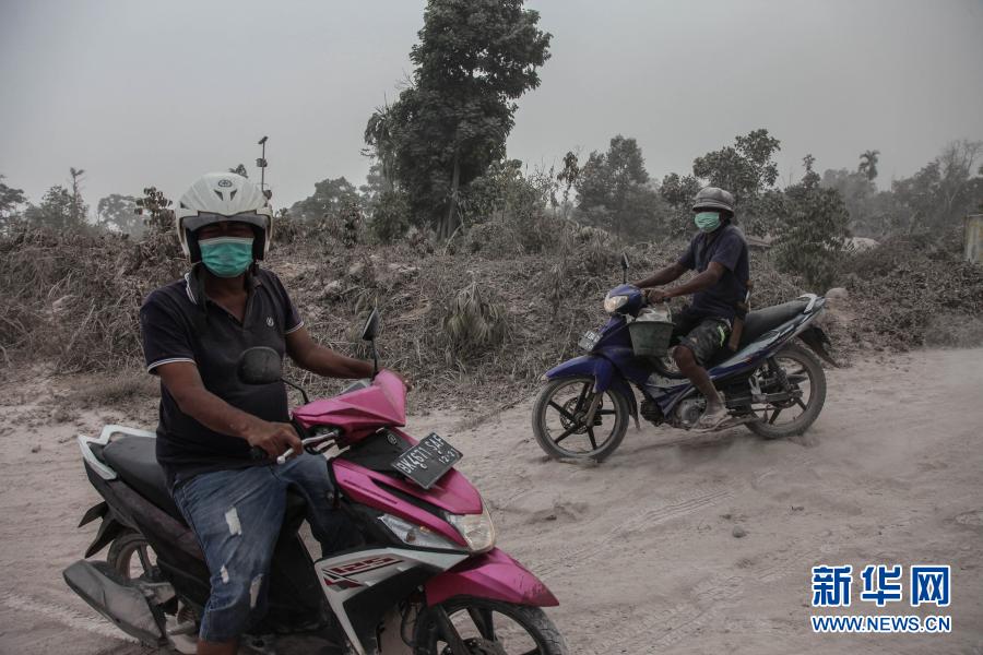 3月2日,印度尼西亞北蘇門(mén)答臘省卡羅的居民行駛在火山灰覆蓋的道路上。印度尼西亞國(guó)家抗災(zāi)署2日說(shuō),北蘇門(mén)答臘省錫納朋火山當(dāng)天上午劇烈噴發(fā),噴出的火山灰高達(dá)5000米。目前尚無(wú)人員傷亡和財(cái)產(chǎn)損失報(bào)告。