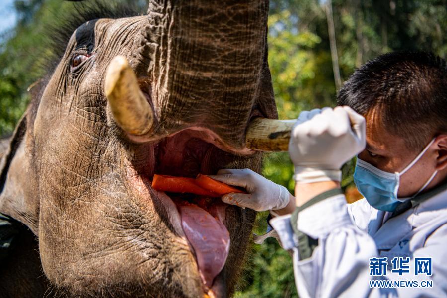 “象爸爸”為一頭名叫“小強”的大象檢查口腔(3月6日攝)。新華社記者 江文耀 攝