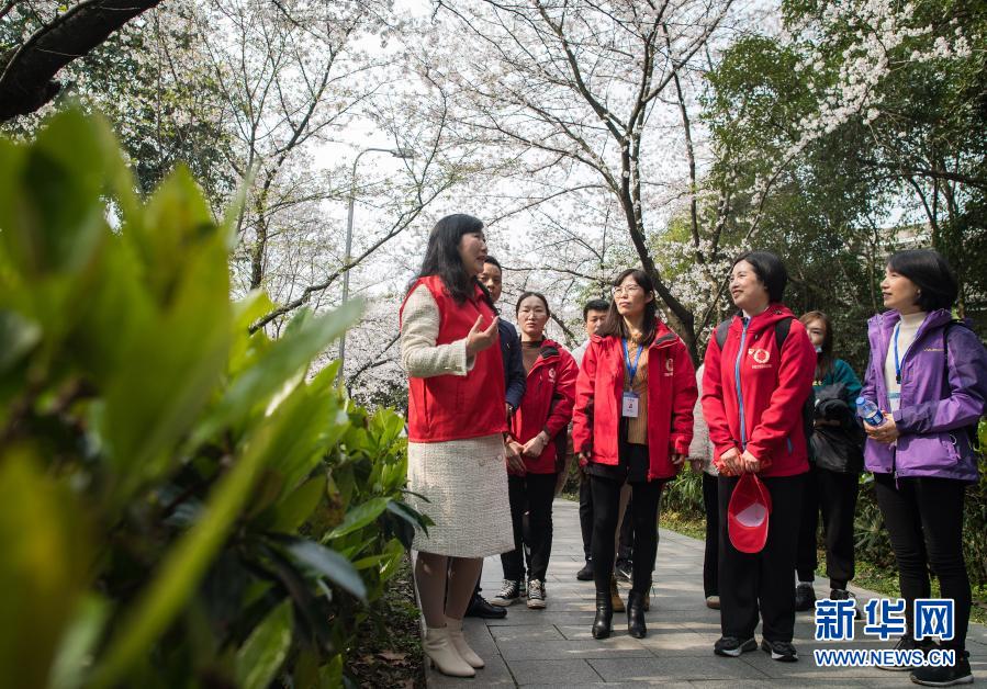 3月13日,武漢大學志愿者為安徽援鄂醫(yī)療隊員介紹武漢大學歷史。新華社記者 肖藝九 攝
