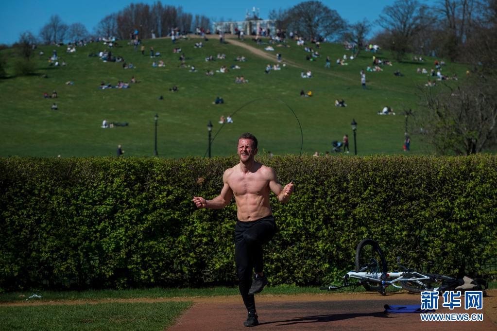 3月29日,一名男子在英國倫敦報春花山的戶外健身區(qū)域鍛煉。