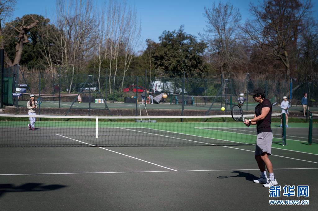 3月29日,人們?cè)谟?guó)倫敦?cái)z政公園的網(wǎng)球場(chǎng)打網(wǎng)球。