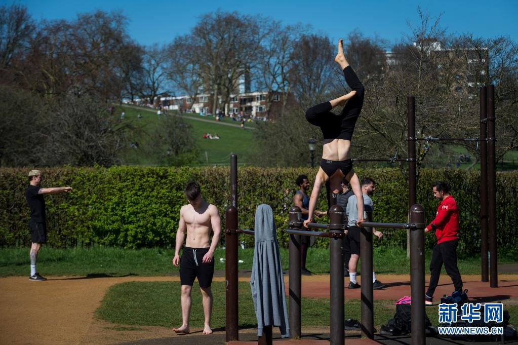 3月29日,人們?cè)谟?guó)倫敦報(bào)春花山的戶(hù)外健身區(qū)域鍛煉。