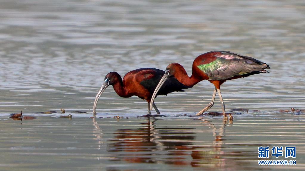 彩鹮在福建省霞浦縣福寧灣灘涂覓食(4月17日攝)。一對(duì)彩鹮近日現(xiàn)身福建省霞浦縣福寧灣灘涂的視頻,經(jīng)當(dāng)?shù)孛襟w播發(fā)后引起轟動(dòng),各地?cái)z影師及當(dāng)?shù)厣鷳B(tài)保護(hù)志愿者紛至沓來(lái),一睹它們的“芳容”。新華社記者 梅永存攝