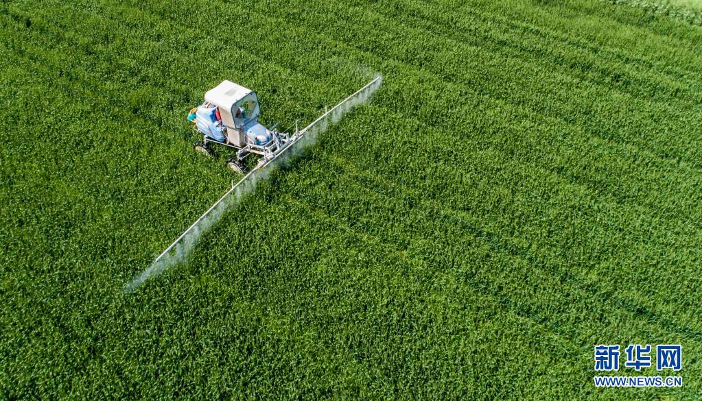 4月20日,在江蘇省海安市隆政街道聯(lián)合村,農民駕駛自走式噴桿噴霧機在麥田噴灑農藥(無人機照片)。