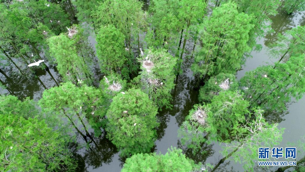 5月12日,在池杉湖國(guó)家濕地公園內(nèi),鳥兒在池杉林間休息(無(wú)人機(jī)照片)。