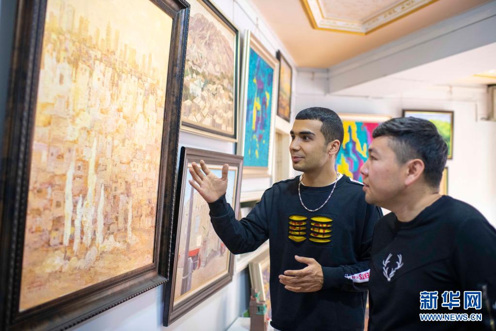 麥麥提吐爾遜江·麥麥提依明(左)在工作室內(nèi)向朋友介紹他創(chuàng)作的關(guān)于喀什的畫作《走進(jìn)新時(shí)代》(5月5日攝)。新華社記者 胡虎虎 攝