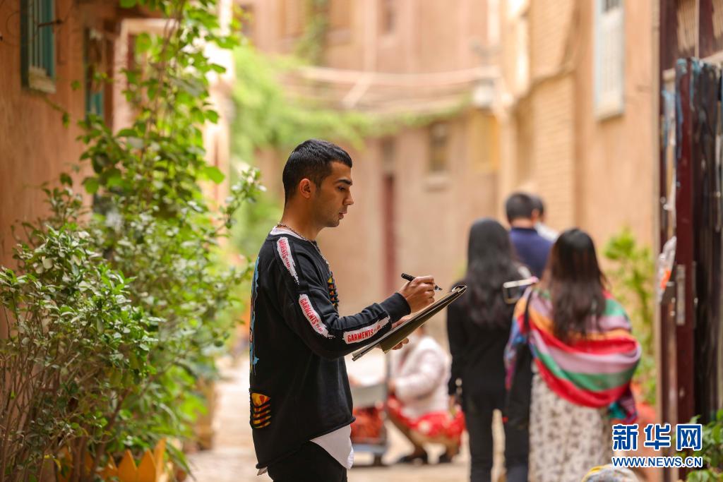 麥麥提吐?tīng)栠d江·麥麥提依明在新疆喀什古城景區(qū)的小巷內(nèi)進(jìn)行速寫(xiě)創(chuàng)作,游客從他身旁走過(guò)(5月6日攝)。新華社記者 胡虎虎 攝