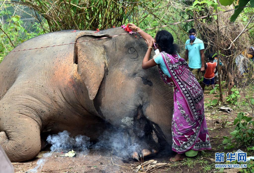 5月14日,一名女子在印度阿薩姆邦納加奧恩地區(qū)一頭死去的象旁禱告。