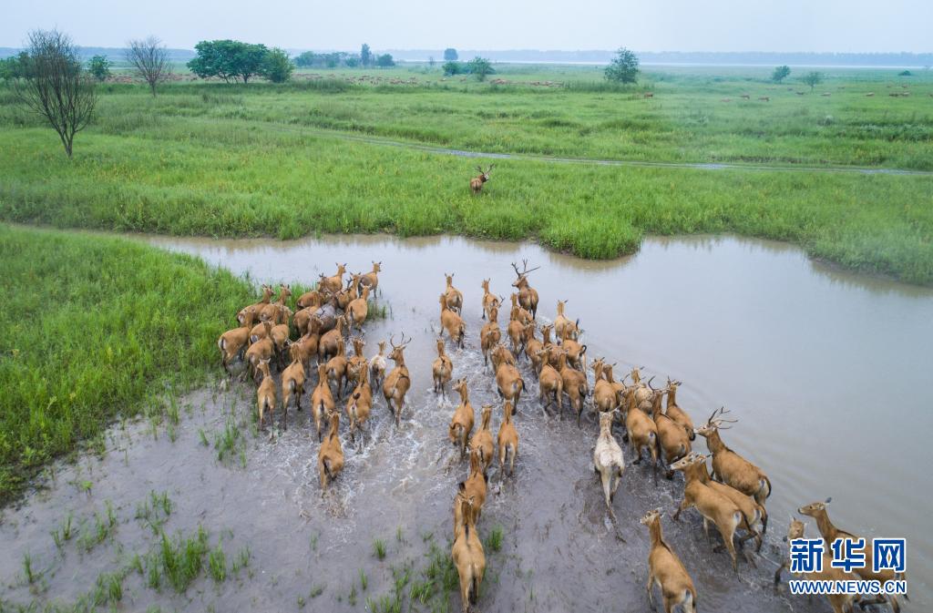 5月17日,一群麋鹿在石首麋鹿國(guó)家級(jí)自然保護(hù)區(qū)內(nèi)活動(dòng)(無人機(jī)照片)。新華社記者 肖藝九 攝