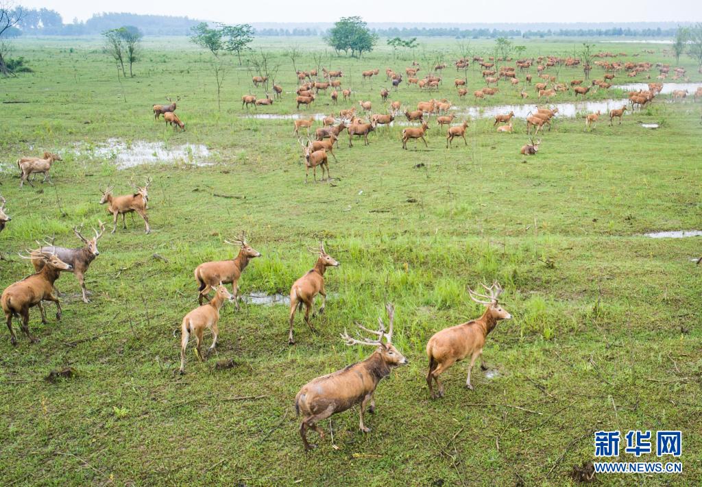 5月17日,麋鹿在石首麋鹿國家級自然保護(hù)區(qū)內(nèi)活動(dòng)(無人機(jī)照片)。新華社記者 肖藝九 攝
