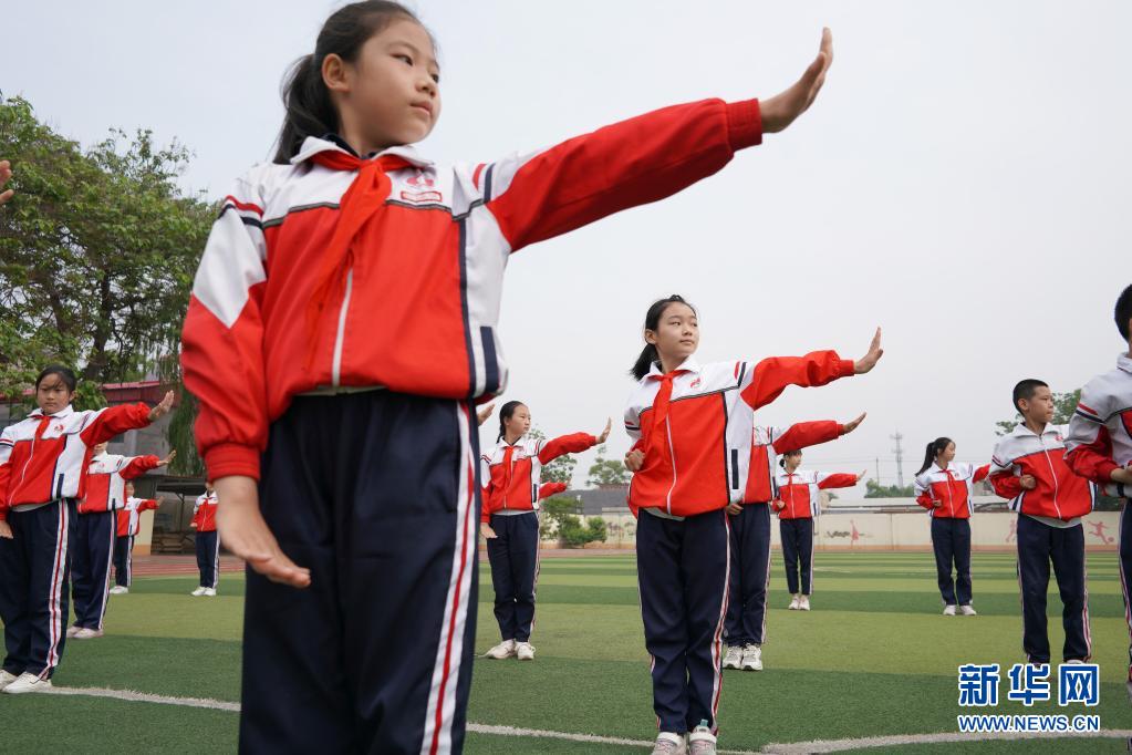 5月19日,邢臺市內(nèi)丘縣實驗小學(xué)學(xué)生在操場上練習(xí)武術(shù)操。