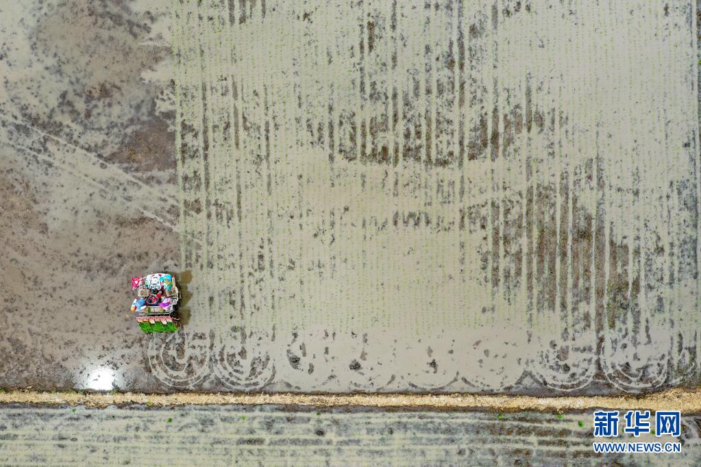 5月27日,在吉林省吉林市永吉縣一拉溪鎮(zhèn)九月豐家庭農(nóng)場,農(nóng)民駕駛農(nóng)機(jī)進(jìn)行水稻插秧(無人機(jī)照片)。
