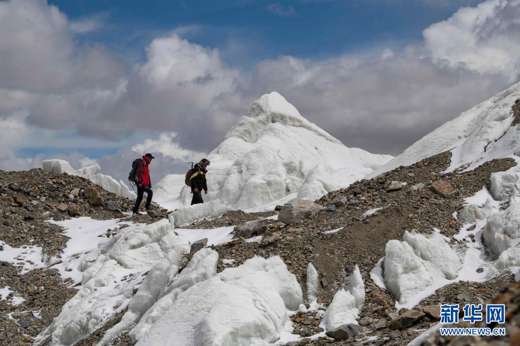 別克米爾扎·圖爾達(dá)力(右)和同伴庫(kù)爾班巴依·努爾麥麥提在適應(yīng)性練習(xí)中從冰川旁經(jīng)過(5月16日攝)。新華社記者 胡虎虎 攝
