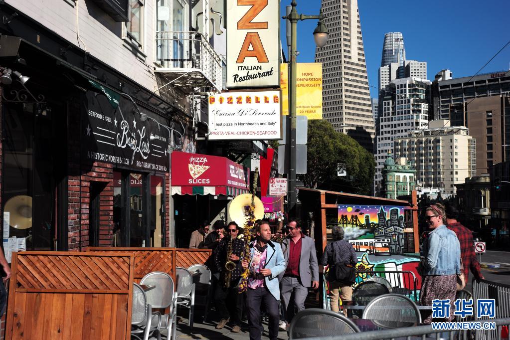 6月15日,一支樂隊(duì)在美國(guó)加利福尼亞州舊金山街頭演奏。