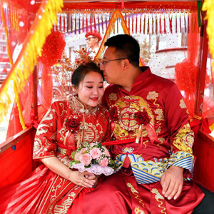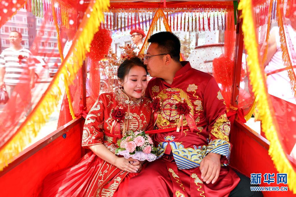 新郎周海云和新娘關(guān)美乘坐花轎前往婚禮儀式現(xiàn)場(6月15日攝)。