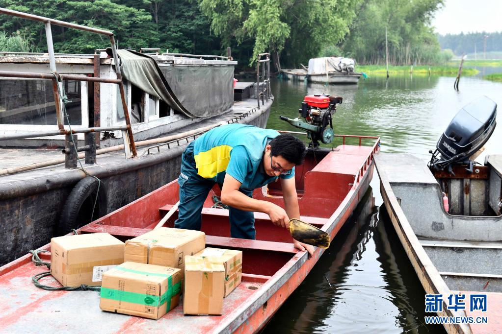 6月20日,在微山縣南陽鎮(zhèn),郵遞員王少朋在清理郵船上的積水。