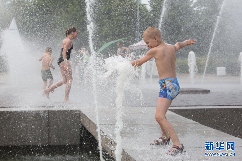 6月22日,孩子們?cè)诙砹_斯圣彼得堡300周年公園戲水消暑。