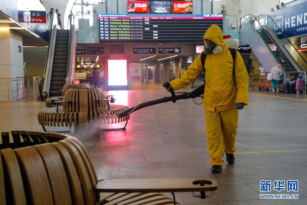 6月24日,工作人員身著防護服在俄羅斯莫斯科一個火車站進行消毒作業(yè)。