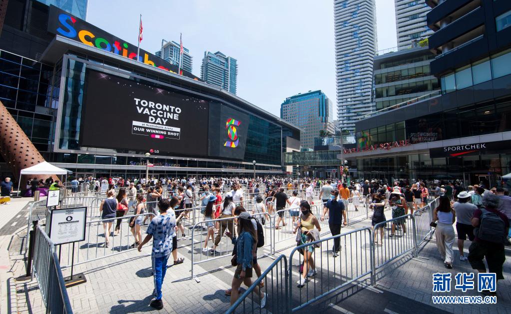 6月27日,在加拿大多倫多,人們排隊進(jìn)入大型新冠疫苗接種中心。