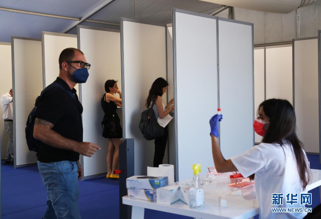 7月5日,在法國戛納為電影節(jié)注冊人員設(shè)立的新冠病毒檢測點,工作人員收集檢測樣本。