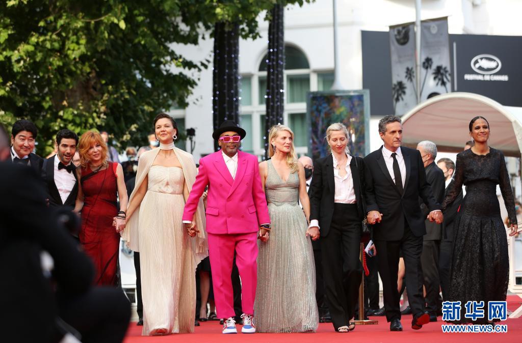 7月6日,第74屆法國(guó)戛納國(guó)際電影節(jié)主競(jìng)賽單元評(píng)委會(huì)主席、美國(guó)導(dǎo)演和制片人斯派克·李(中)攜主競(jìng)賽單元評(píng)委出席開幕式紅毯。