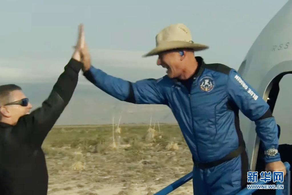 這張美國藍(lán)色起源公司7月20日發(fā)布的視頻截圖顯示,“新謝潑德”飛行器在美國得克薩斯州西部著陸后,該公司創(chuàng)始人杰夫·貝索斯(右)走出飛行器慶祝。