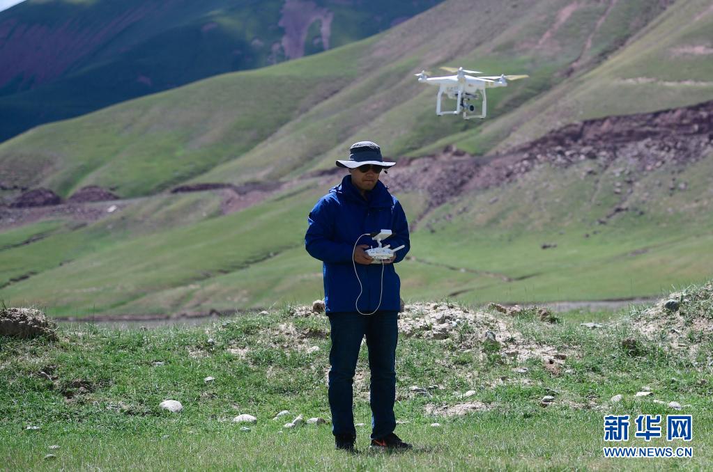 2021年長(zhǎng)江源綜合科考的科考隊(duì)員趙保成在使用無人機(jī)觀測(cè)長(zhǎng)江源地區(qū)生態(tài)環(huán)境(7月24日攝)。