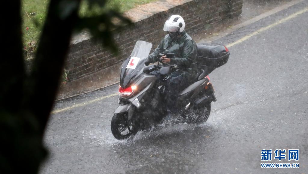 7月25日,一名男子騎著摩托車在英國倫敦的大雨中行駛。